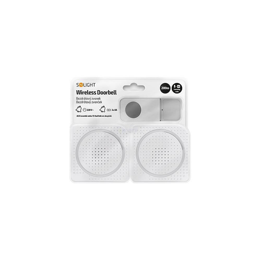 8 zvonky, na každém zvonku může být nastavena jiná melodie36 volitelných melodiíLED indikátor zvonění na zvonku i tlačítkutlačítko s krytem na jmenovku a se stříškou proti deštivodotěsná ochrana tlačítka IP56nastavení hlasitosti zvonku: 4 stupně 25 - 110dBuchycení tlačítka pomocí samolepící podložky nebo montážních otvorůbarva: bíládosah signálu na otevřeném prostranství: 200mpřenosová frekvence: 433MHznapájení:tlačítko: 1 x 3V (CR2032) baterie (součástí balení)zvonek 1: AC 230V - do zásuvkyzvonek 2: 3 x AAA (LR03) baterie (nejsou součástí balení)spotřeba energie: přijímač (zvonek) v klidovém režimu: <0,5Wvysílač (tlačítko) v pracovním režimu: <10mWpracovní teplota: tlačítko -20 °C až +60 °C, zvonek -10 °C až +45 °Cnáhradní tlačítko Solight č.