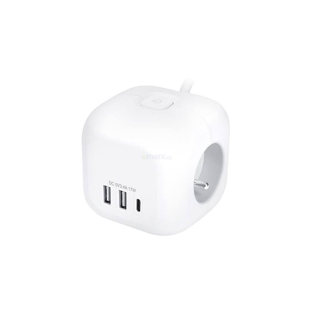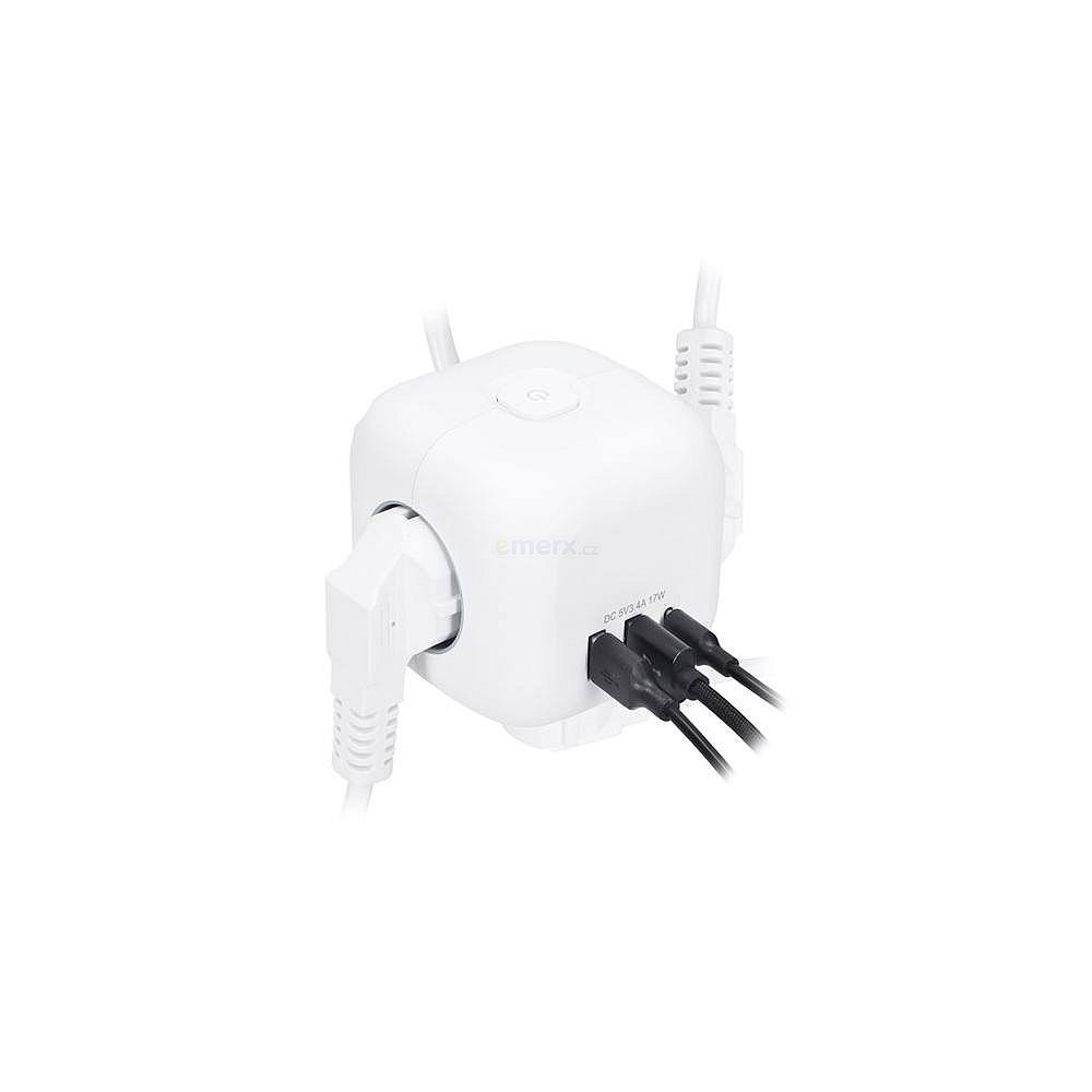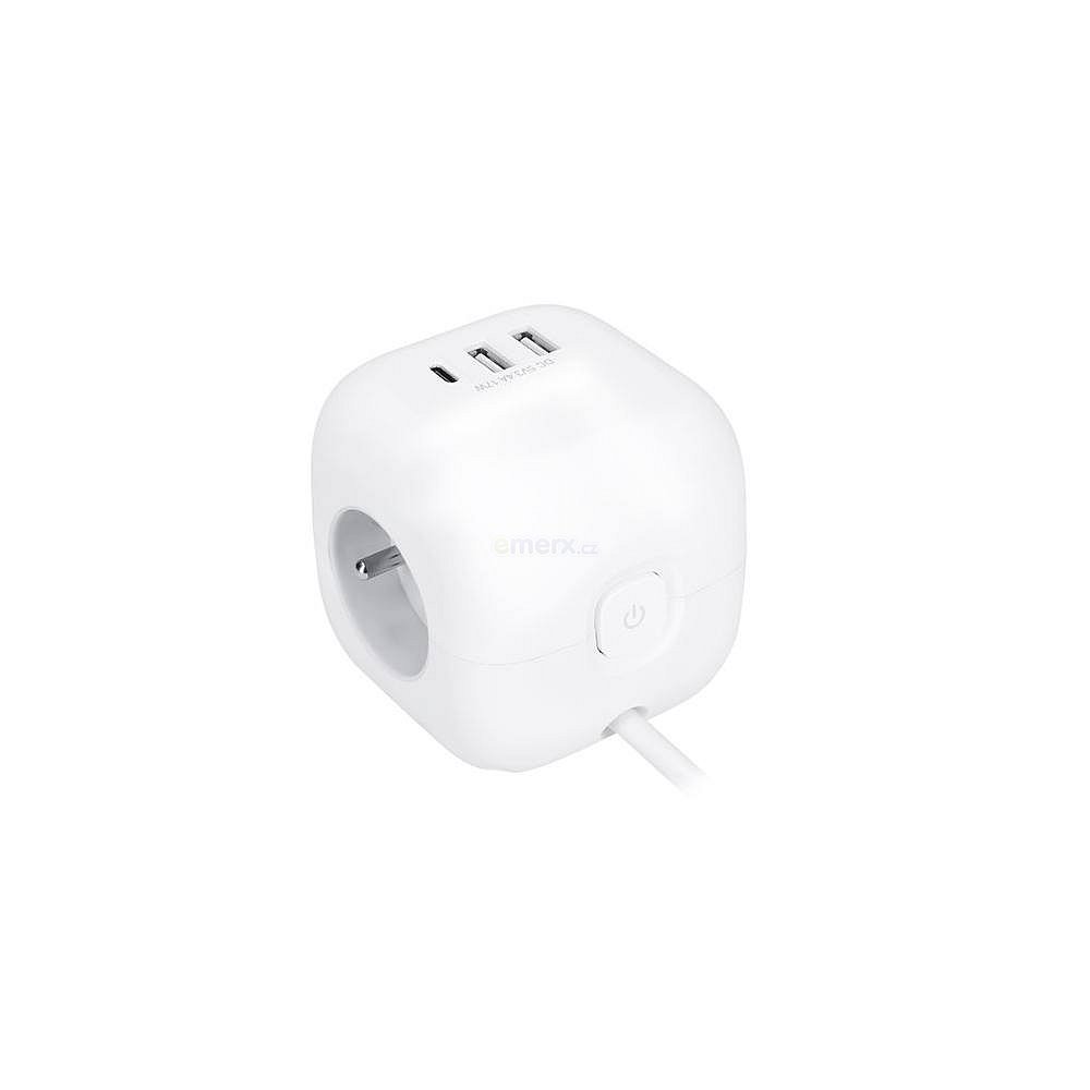Kompaktní design a snadné použitíProdlužovací přívod ve tvaru kostky s délkou strany 8 cm spojuje tři uzemněné zásuvky s dětskou pojistkou a USB nabíječku s porty USB-C a USB-A.