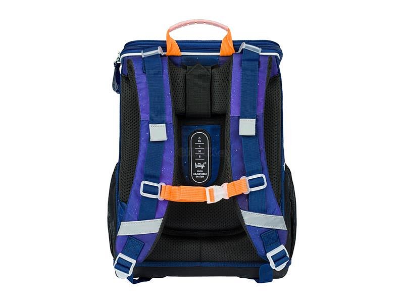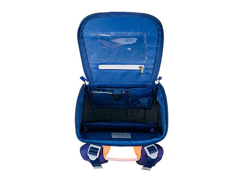 Uvnitř aktovky je průhledná kapsa na rozvrh a vnitřní organizér umožňující rovnoměrné rozložení hmotnosti, doplněný gumičkou pro fixaci.
