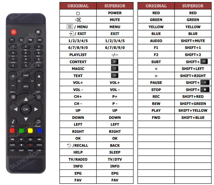Náhradou za originální dálkový ovladač Amiko k tomuto přístoji je značkový ovladač EMERX PReDATOR (vpravo), který má jiný vzhled (barvu, rozložení tlačítek apod.), ale stejné funkce jako originální ovladač Amiko. Dálkový ovladač EMERX PReDATOR nabízíme jako levnější alternativu k originálnímu ovladači nebo proto, že se již tento originální ovladač nevyrábí. Námi zaslaný ovladač nemusíte nijak programovat. Bude nastaven přesně pro váš přístoj Amiko, se zachováním všech funkcí.
