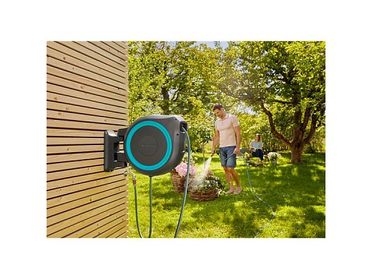 Díky nástěnnému boxu na hadici RollUp XL je zavlažování velké zahrady příjemné a jednoduché. Tento kompaktní úložný prostor na hadici trvale připevníte na stěnu domu a pomocí připojovací hadice jej připojíte k vodovodnímu kohoutku. Díky 35 metrů dlouhé hadici a boxu otočnému o 180° se stane zavlažování vašich rostlin potěšením a nikoliv námahou. Box na hadici následuje váš směr pohybu a zabraňuje zalamování nebo uzlování hadice. Poté, co jste hadici vytáhli na požadovanou délku, extra krátké zajišťovací body hadici automaticky uchopí a zafixují ji ihned po vašem zastavení. Lehkým zatažením za konec hadice se uvolní zajišťovací mechanismus a integrovaná ocelová pružina navine vytaženou zahradní hadici plně automaticky, spolehlivě a rovnoměrně za vás. Díky inovativní technologii RollControl je navinutí obzvláště bezpečné a kontrolované. Integrovaná vodící cívka zajišťuje úhledné a rovnoměrné navinutí bez zamotávání. Šroubení na kohoutek a rychlospojky na boxu jsou součástí Original GARDENA systému, takže můžete kdykoli připojit další zavlažovací koncové přístroje GARDENA. Postřikovače GARDENA budete mít vždy po ruce: lze je připevnit pod nástěnný držák a uskladnit je tam pro úsporu místa. Vysoce kvalitní materiál je odolný proti UV-záření a mrazu, chráněn před poškozením povětrnostními vlivy, a proto jej lze používat po celý rok. Uložení hadice je navíc zajištěno pojistkou proti krádeži. Součástí nástěnného boxu na hadici RollUp jsou všechny potřebné připojovací a montážní díly: nástěnný držák, spojovací hadice, všechny potřebné díly Original GARDENA systému a postřikovač se dvěma různými možnostmi rozprašovacího paprsku.