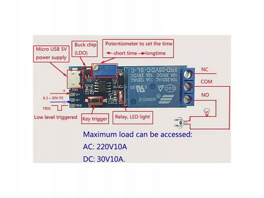 Časový spínač pro krátké časy s releovým výstupem 230VAC/5A. Vhodný pro prodloužení doby sepnutí tlačítka v intervalu 0–24sec.