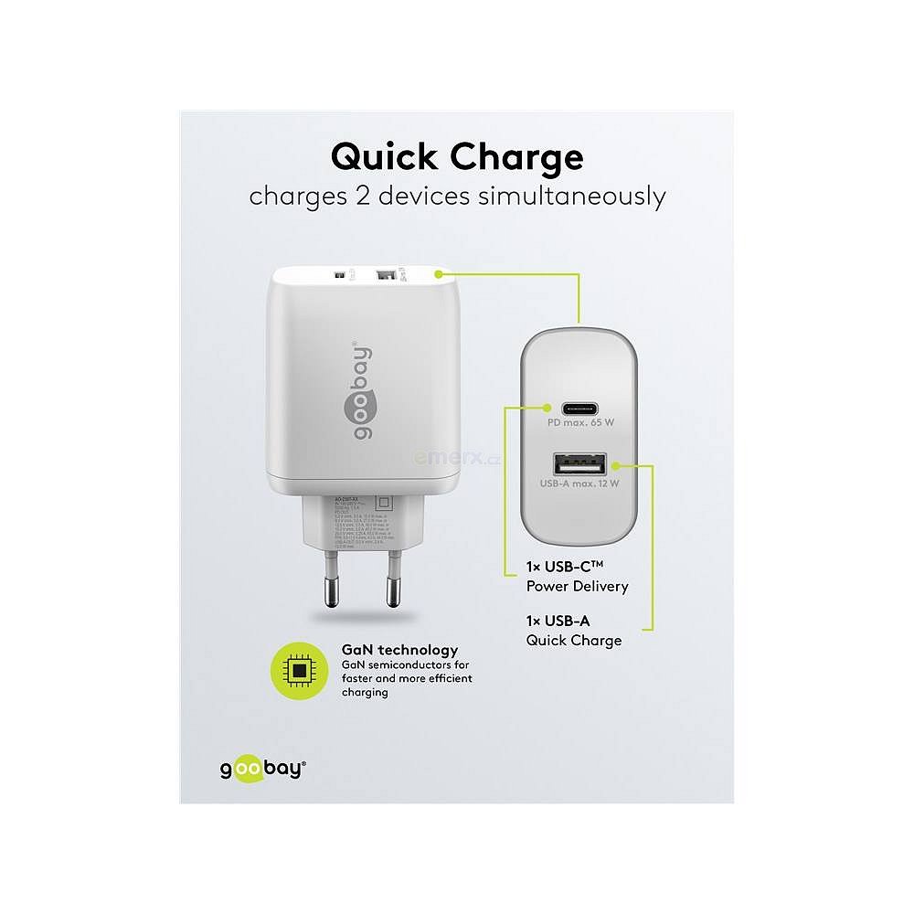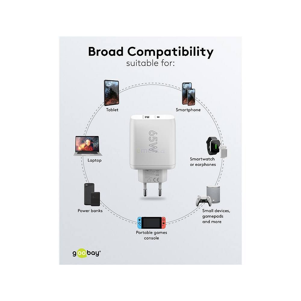 Díky výkonnému výkonu 65 W a všestranným USB portům je tato síťová nabíječka vhodná pro širokou škálu zařízení – od chytrých telefonů až po vysoce výkonné notebooky.Díky technologii rychlého nabíjení napájecí adaptér Goobay napájí notebooky, jako je Apple MacBook, přes USB-C™ Power Delivery a současně nabíjí chytré telefony, sluchátka atd.