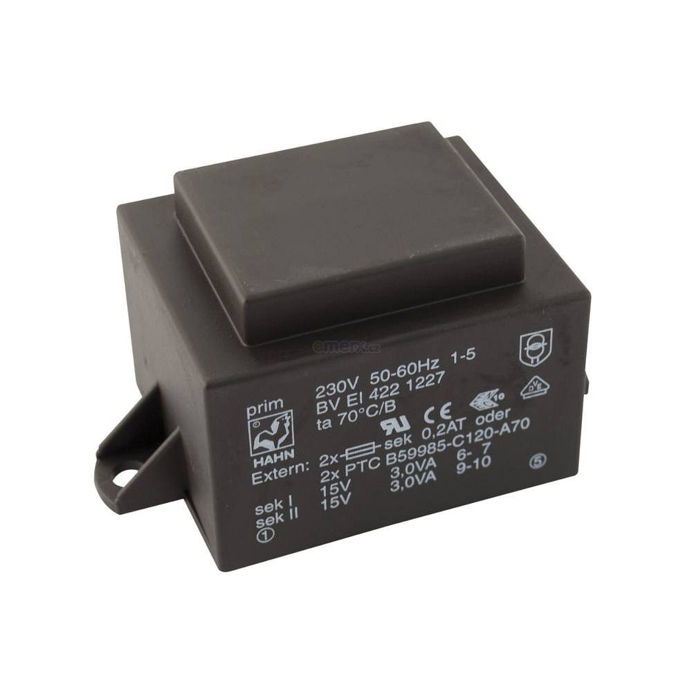 EI 42/14,8; 2x15V/0,2A; 6VA; 230V; 55x36,8x32,3mm; 2 úchyty