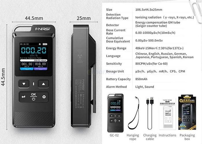 FNIRSI GC-02 je detektor jaderného záření s elegantním designem a kompaktními rozměry. Používá Geiger-Müllerovu trubici k detekci ionizujícího záření, včetně gama záření, beta záření a rentgenového záření. Zařízení je vybaveno 1,5palcovým IPS LCD displejem s vysokým rozlišením, který nabízí jasné a přehledné rozhraní a na první pohled zobrazuje hodnoty v reálnémčase, průměrné hodnoty, maximální hodnoty a kumulativní hodnoty. Uživatelé mohou konfigurovat prahové hodnoty alarmu, upravovat časy spánku a vypnutí a přepínat mezi osmi jazyky. Mezi další funkce patří časovaný režim monitorování a zobrazení historie, které zaznamenává až 10 měření do energeticky nezávislé paměti, jež se uchovávají i po vypnutí zařízení. GC-02 je napájen dobíjecí lithiovou baterií.