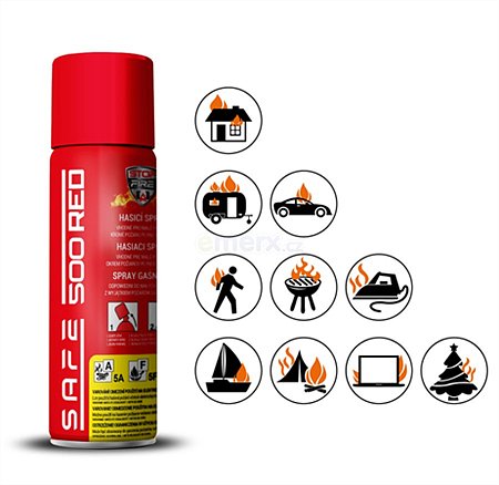 Univerzální hasicí sprej SAFE 500 RED pro hašení požáru typu A (pevných hořlavých látek), F (jedlých olejů a tuků), E (elektrických zařízení pod proudem do 1000 V). Je primárně určen k hašení začínajících požárů v domácnostech, kuchyních, garážích, automobilech, kancelářích, chatách atd. Možnost použití až do - 20 °C.