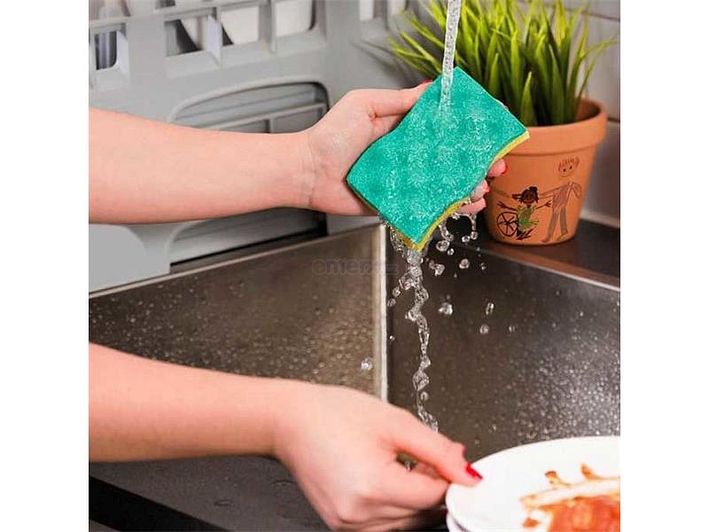- Díky speciální abrazivní vrstvě se drobky a nečistoty neodstávají do houbičky a můžete stále pokračovat v čištění pomocí čisté a hygienické houbičky