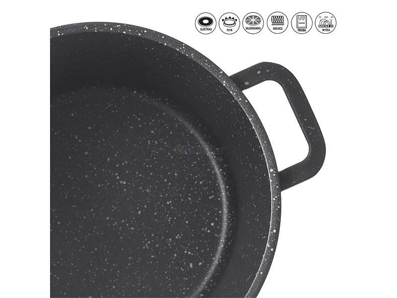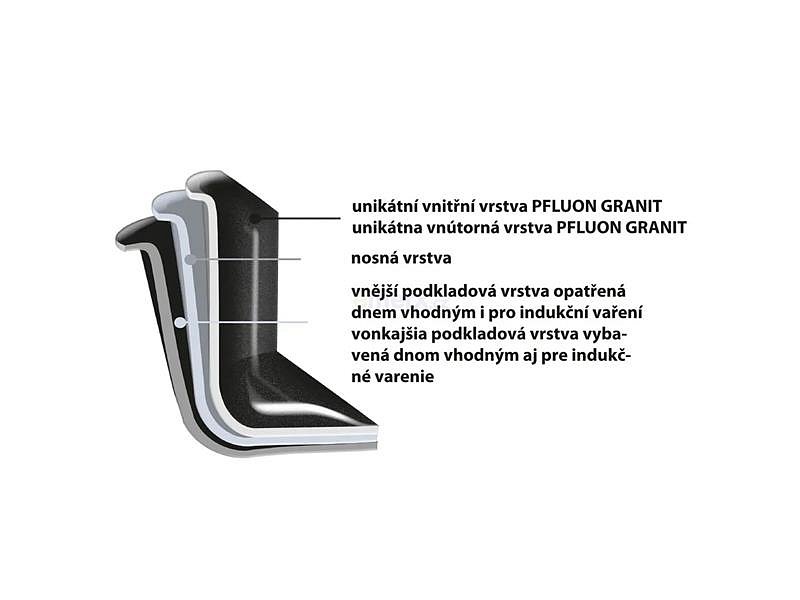 Masivní hrnec s poklicí s velmi kvalitním nepřilnavým povrchem PFLUON GRANIT. Můžete v něm vařit, smažit, dusit, opékat a zapékat s minimální potřebou tuku. Připravovaný pokrm se nepřipéká. Poklice s otvorem pro únik přebytečné páry. Vhodný na všechny typy spotřebičů včetně indukce a trouby. Doporučujeme použití kuchyňské chňapky. U plynových sporáků volte správnou velikost plamene, u elektrických, sklokeramických a indukčních vařičů je nutné zvolit odpovídající velikost ploténky. Připravovaný pokrm lze na sporáku připravit a pak jej vložit do trouby. Připravené jídlo můžete pohodlně skladovat v hrncích také v chladničce.