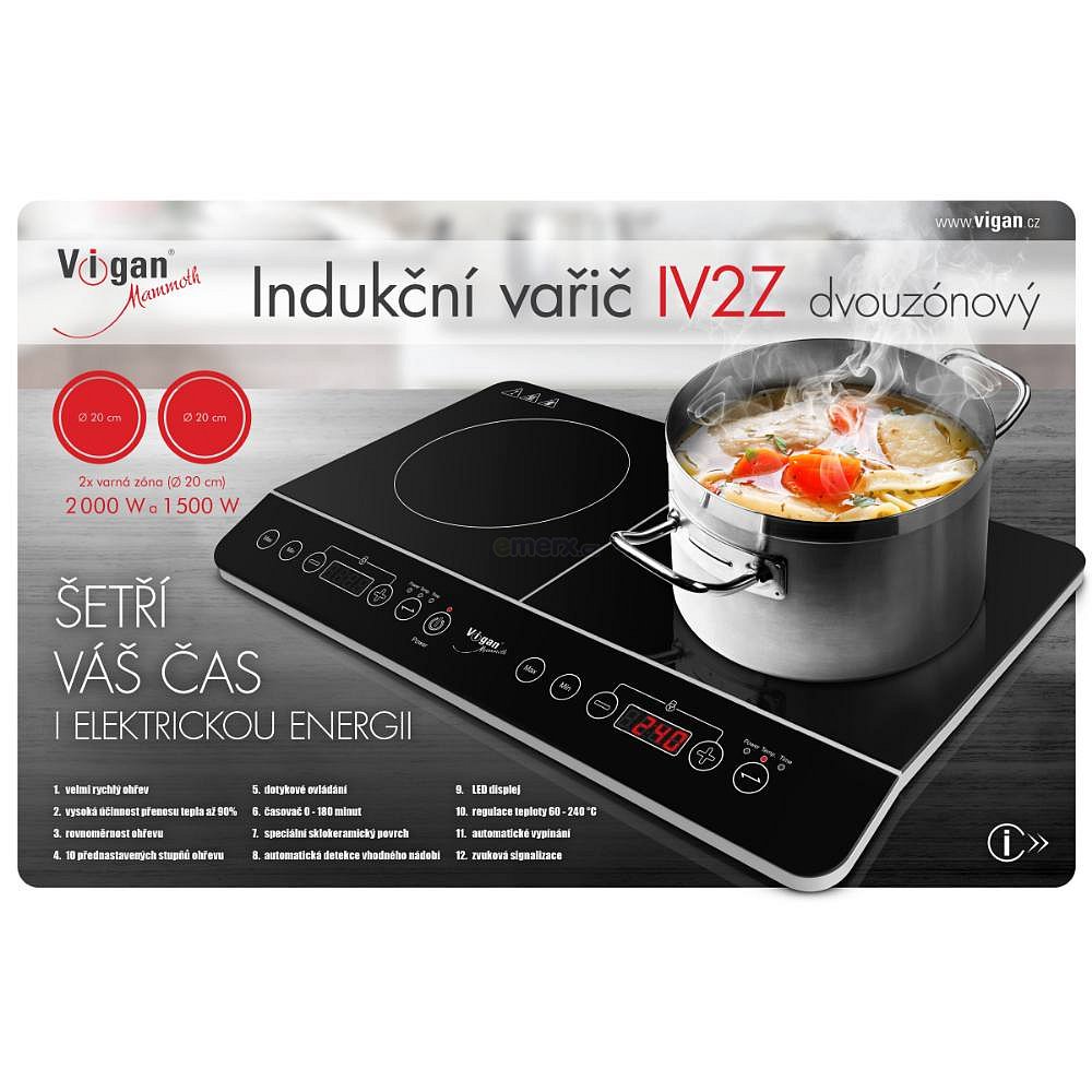 Indukční dvouplotýnkový elektrický vařič Vigan Mammoth IV2Z, s průměrem plotýnek 20 cm, sklokeramický povrch, velká úspora času a elektrické energie, minimální ztráty elektrické energie s vysokou účinností přenosu tepla až 90%. (IV2Z)
