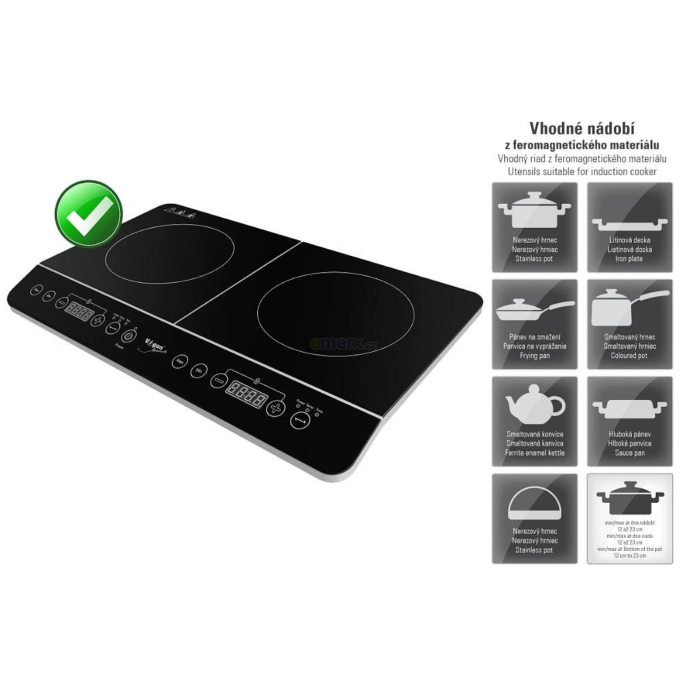 Indukční dvouplotýnkový elektrický vařič Vigan Mammoth IV2Z, s průměrem plotýnek 20 cm, sklokeramický povrch, velká úspora času a elektrické energie, minimální ztráty elektrické energie s vysokou účinností přenosu tepla až 90%. (IV2Z) Indukční dvouplotýnkový elektrický vařič Vigan Mammoth IV2Z, s průměrem plotýnek 20 cm, sklokeramický povrch, velká úspora času a elektrické energie, minimální ztráty elektrické energie s vysokou účinností přenosu tepla až 90%. (IV2Z)