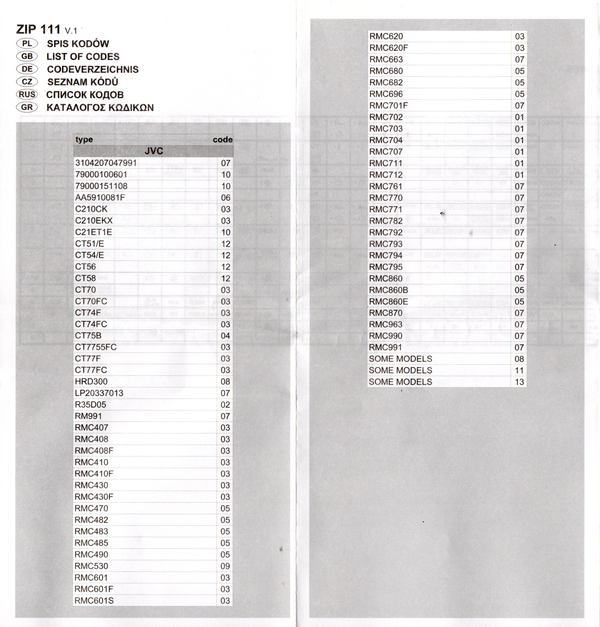 JVC ZIP111 Univerzální dálkový ovladač TV