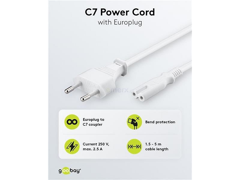 Univerzálně vhodný jako napájecí kabel nebo připojovací kabel na zařízeních bez ochranného uzemnění (GND) a s max. zatížitelností 2,5 A.