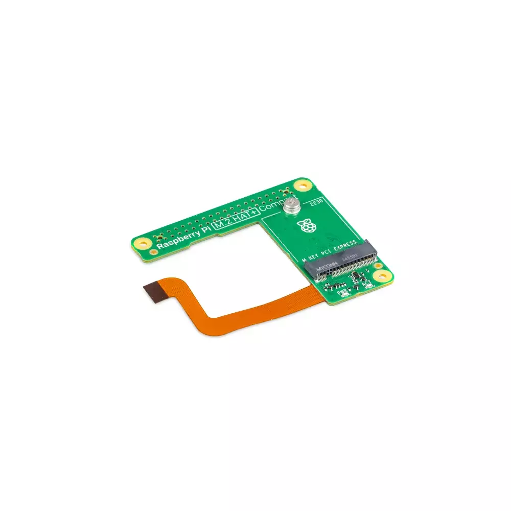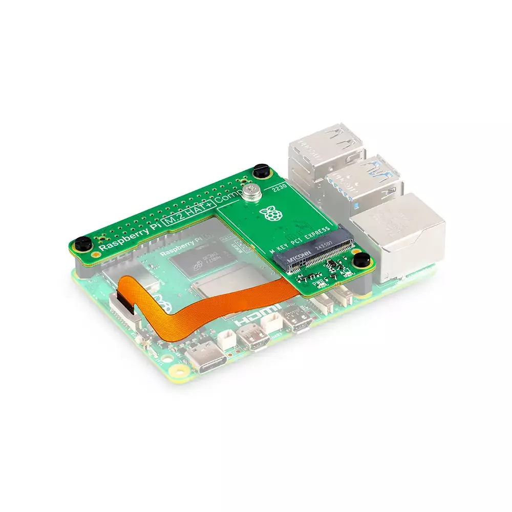 Připojuje se přes PCIe FPC konektor pomocí „flex/rigid“ FPC pásku integrovaného přímo do desky HAT+, takže není potřeba samostatný FPC kabel.