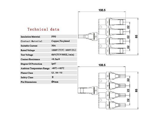 Konektor pro solární panely MC4 rozbočení 1x zdířka,4x konektor Konektor pro solární panely MC4 rozbočení 1x zdířka,4x konektor