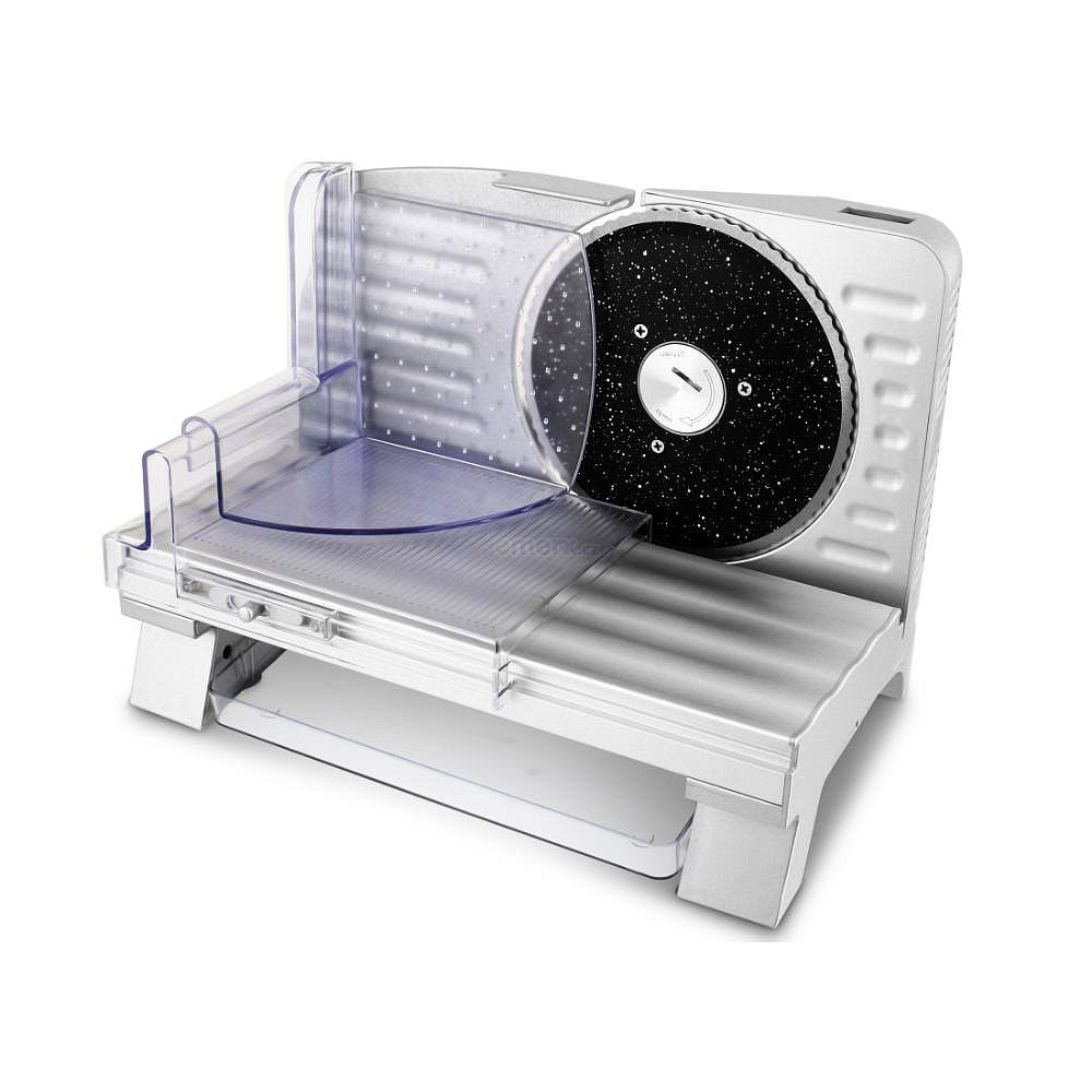 Elektrický kráječ potravin Vigan Mammoth EK1Kvalitní elektrický kráječ potravin se stabilní hliníkovou základnou, z převážné části kovové provedení, v balení dva odnímatelné krájecí kotouče o průměru 17 cm, pro různé druhy potravin (hladký nerezový pro krájení sýrů, masa, salámů, ovoce, zeleniny apod., 2 stupňový přepínač včetně permanentního chodu, zubatý nerezový kotouč s keramickým povrchem, pro krájení pečiva), nastavitelná šířka řezu od 1-20 mm otočným regulátorem, odnímatelný posuvný podavač potravin s dorazem, zásobník na nakrájené potraviny nebo drobky, přítlačný podavač potravin s ochranou prstů a trny proti nechtěnému posunu potravin při krájení, protiskluzové silikonové nožky pro dokonalou stabilitu s přisátím k podkladu, úložný prostor pro napájecí kabel ve spodní části přístroje, odnímatelné části kráječe pro snadné čištění a mytí (posuvný podavač potravin, zásobník na nakrájené potraviny nebo drobky, přítlačný podavač potravin s ochranou prstů, krájecí kotouč), příkon 160WNapájení: 220-240V ~ 50 / 60HzPříkon – 160WHmotnost netto bez obalu - 2,95 kgHmotnost brutto s obalem - 3,45 kgRozměry bez obalu - 341 x 240 x 242 mm (délka x šířka x výška)Rozměry s obalem - 350 x 260 x 250 mm (délka x šířka x výška)Množství v kartonu - 2 ks