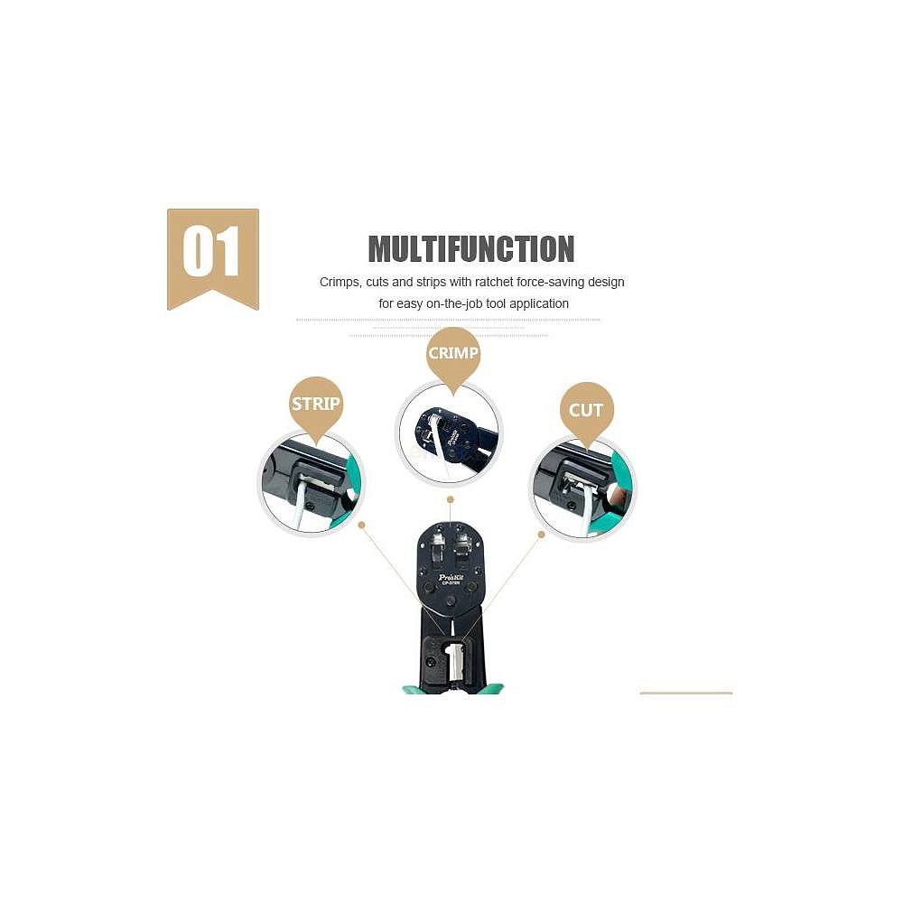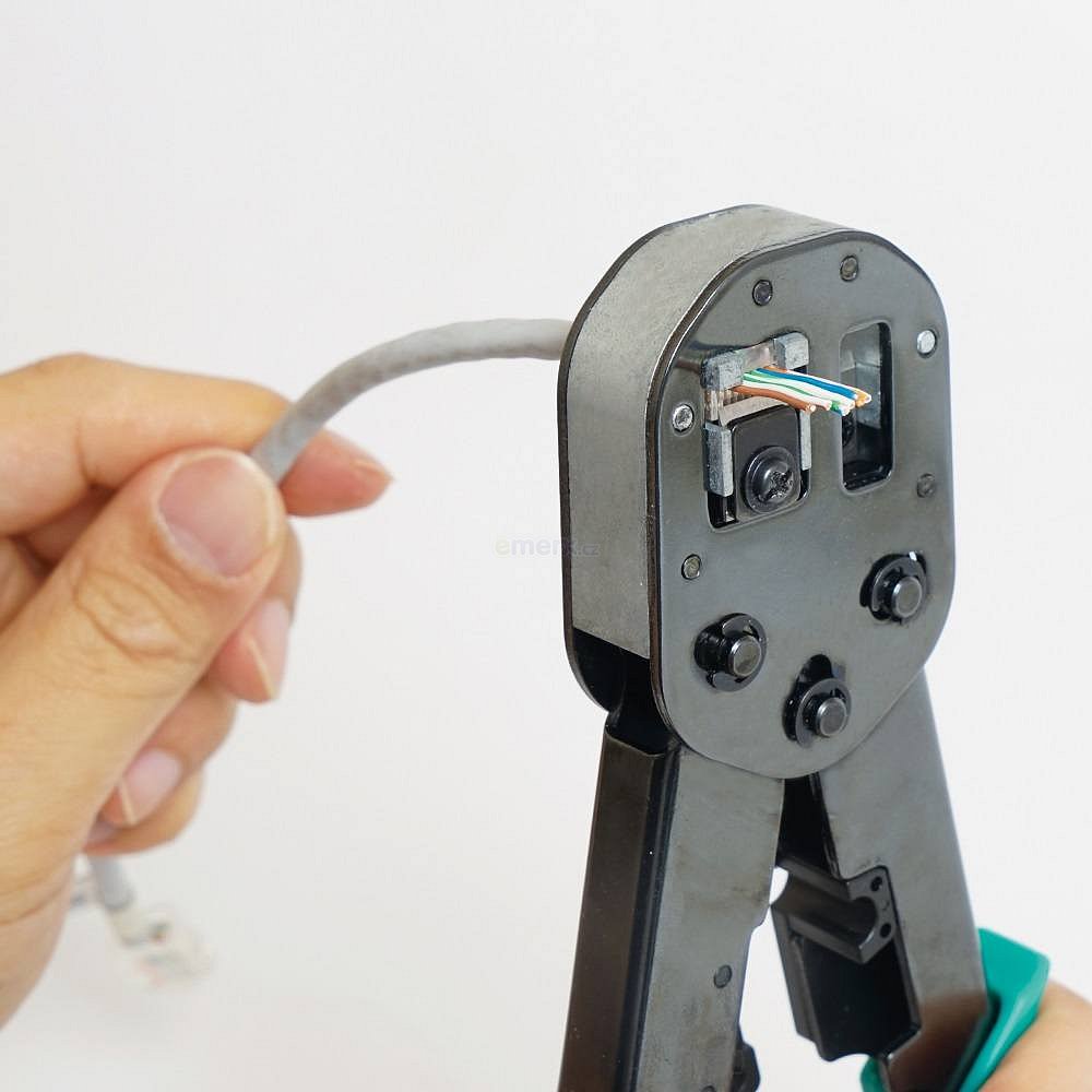 Lisovací kleště pro průchozí i standartní RJ45 konektory, stíněné i nestíněné.Vlastnosti:Krimpuje a ořezává v jednom krokuOdizolování kroucených párů a plochých vodičů.Pokročilý ráčnový mechanismus.Dvoubarevné rukojeti.