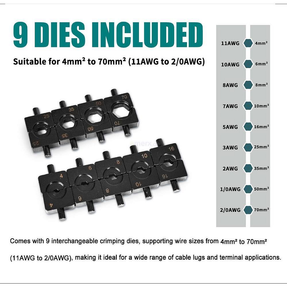 • 9 krimpovacích čelistí v balení – Pokrývá 11 AWG až 2/0 AWGDodává se s 9 vyměnitelnými krimpovacími čelistí, které podporují velikosti vodičů od 11 AWG do 2/0 AWG, což je ideální pro širokou škálu kabelových ok a koncovek.