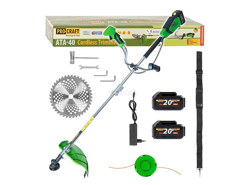 AKU křovinořez Procraft ATA-40 je určen k sečení a vyžínání travnatých ploch, k odstranění plevelů. Silný a tichý motor s otáčkami až 7000 zaručuje dlouhou bezporuchovou práci. Možnost plynulé regulace otáček sečení v závislosti na hustotě a síle porostu a požadavku na přesnost práce. Stroj je dodávaný v kartonu s 2 bateriemi 20V 4Ah, nabíječkou, jednoramenným popruhem, strunovou hlavou, kovovým kotoučem, montážním klíčem. Balení karton.