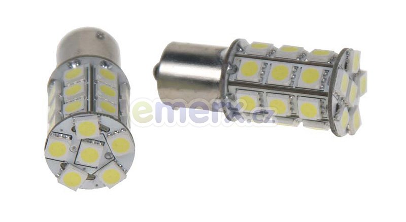 Náhradní LED žárovka s paticí BA 15s bílá, 27 3-čipových SMD LED diod, napájecí napětí 12V, příkon 7,8W.