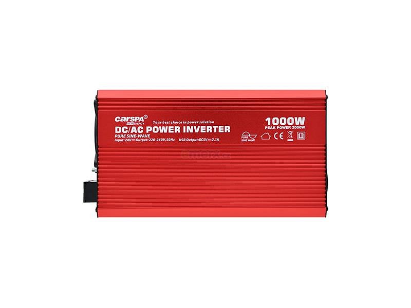 Měnič napětí 24V/230V+USB 1000W, CARSPA P1000, čistá sinusovka . Měnič je vhodný pro spotřební elektroniku, nářadí i jiné spotřebiče s nároky na čistý sinusový průběh výstupního napětí. Součástí je dálkové ovládání s kabelem a indikací zapnutí a chybových stavů.