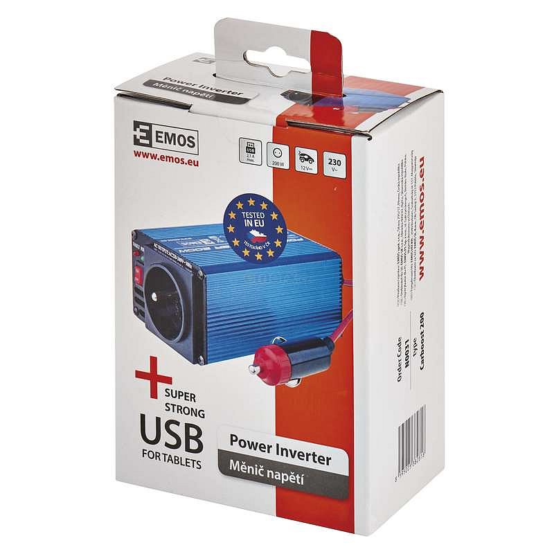 Napěťový měnič 12/230V 200W s modifikovaným sinusem a USB výstupem 2100mA Tato verze neumožňuje zpětné dobíjení akumulátoru. - trvalý výkon 200W, modifikovaný sinus - výstupní napětí: 1xzásuvka 230V AC 50Hz a 1x USB zásuvka 5V DC - výstupní proud USB: max. 2100mA - klidový odběr proud: 0,3A - vstup 12V – konektor do autozapalovače - LED indikace - integrované ochrany – proti přehřátí, přetížení, vybití akumulátoru, zkratu a přepólování - účinnost: 85-90% - rozměry: 140x76x54 mm Poznámka: Měnič není určen pro indukční zátěž.