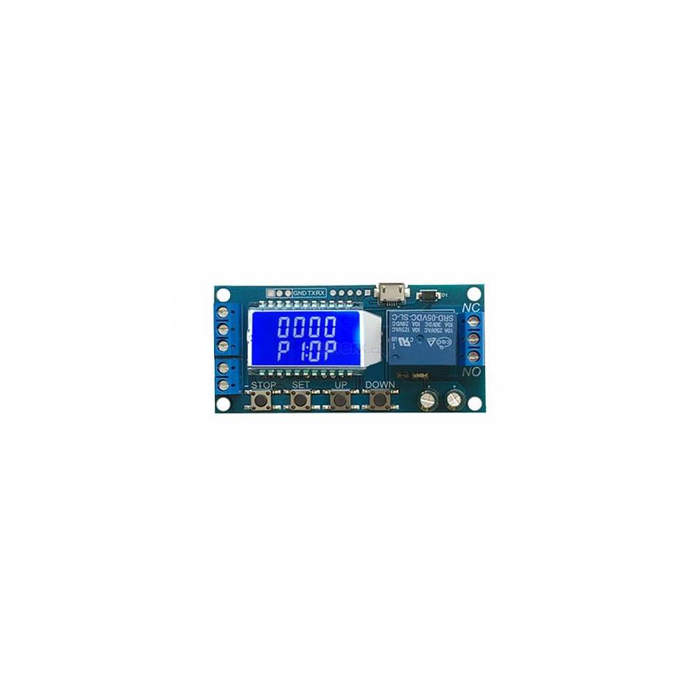 Modul programovatelného relé s LCD displejem a možností programování skrze UART.Popis módů:P1 - Po vstupním impulzu je relé sepnuto po nastavenou dobu OPP2 - Po vstupním impulzu je relé sepnuto po nastavenou dobu OP, po vstupním impulzu během odpočítávání OP se spustí nový časovačP3 - Po vstupním impulzu je relé sepnuto po nastavenou dobu OP, po vstupním impulzu během odpočítávání OP se časovač resetuje, dojde k odpojení relé a časovač se zastavíP4 -P5 -P6 -P7 - Po vstupním impulzu, relé se sepne po uplynutí doby OP, během odpočítávání, po vstupním impulzu se časování zastavíNastavení parametrů:- Stiskněte a podržte tlačítko SET pro nastavení módu a parametrů- Tlačítky UP/DOWN měníte módy P1 - P7- Krátce stiskněte tlačítko SET pro zvolení módu a pokračování v nastavení parametrů- V tomto nastavení parametrů stiskněte tlačítko SET pro přepínání parametrů, které budou modifikovány.