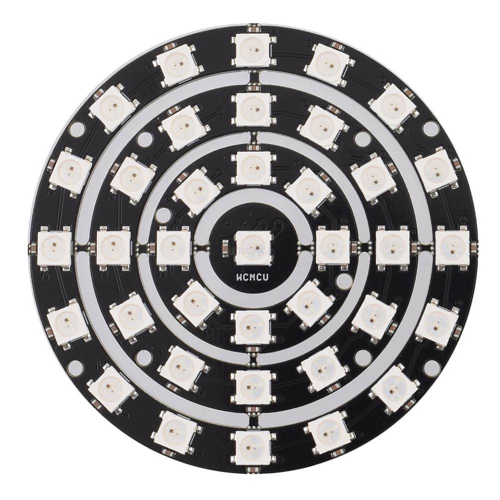 Modul s digitálně řízenými RGB SMD diododami, každá LED obsahuje čip WS2812Stačí připojit napájení a jeden datový vstup.Jednotlivé moduly lze řadit sériově za sebe, lze tedy vytvořit v podstatě libovolnou plochu/sestavu.Napájení 5V37x SMD5050 RGB digitální LED (WS2812)Upozornění.