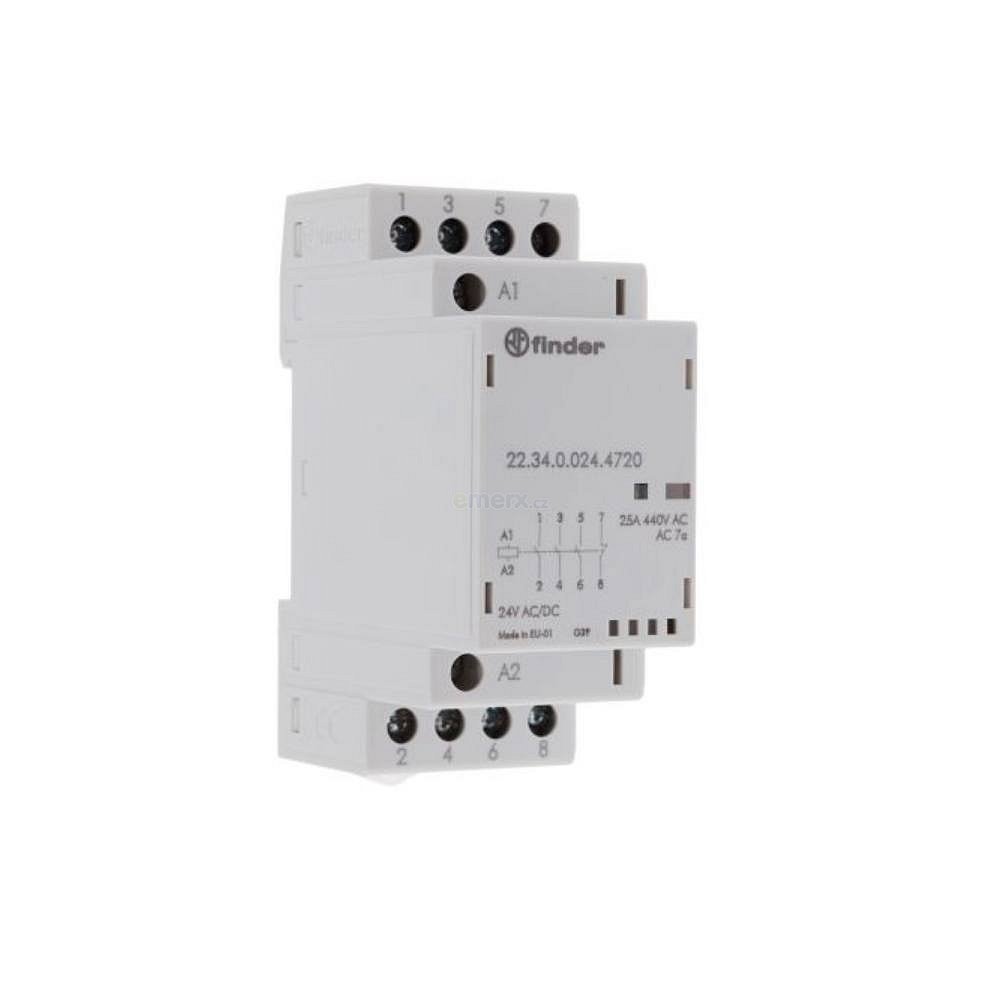 Modulový stykač na DIN lištu, 24V AC/DC, 4-pólový, 3-spínací, 1-rozpínacíModulový stykač je určen pro spínání elektrických obvodů, zejména odporových zátěží,třífázových asynchronních motorů atd.Technické parametry:Jmenovité napětí cívky 24V AC; 24V DCKonfigurace kontaktů: 3-spínací,1-rozpínací; 3PST NO + SPST NCIndikace: mechanická + LEDMaximální spínaný proud 25AMaximální napětí kontaktů 400V ACMateriál konktaktů: AgSnO2Rozměry DIN: 2-modulovýPracovní teplota: -20 ..