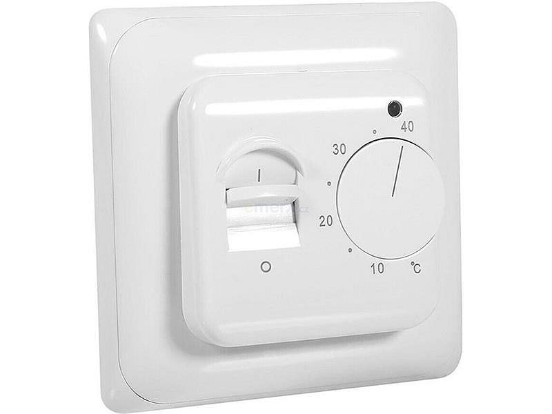 Jednoduchý nástěnný termostat pro topné rohože podlahového topení se sondou o délce 3m. Montáž do hluboké krabice pod omítku.