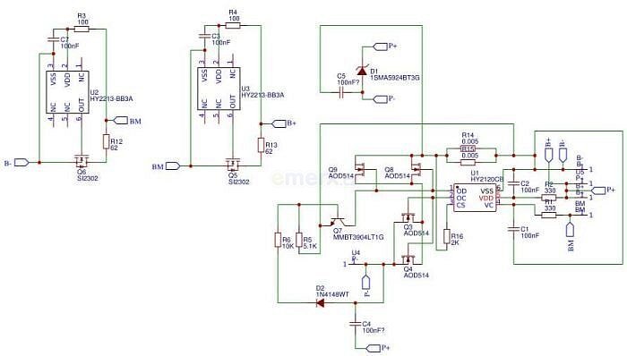 Ochranný obvod a balancér pro 2 Li-Ion články 18650 proud do 10A