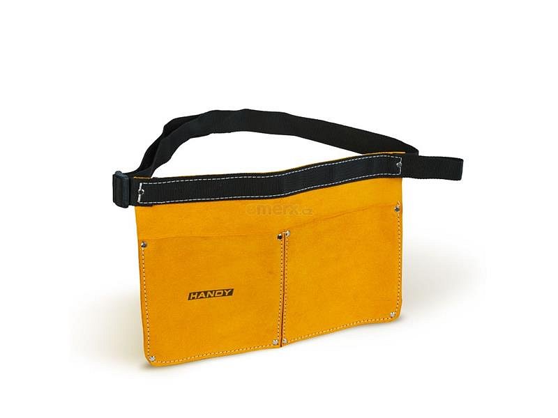 Odolné opaskové pouzdro z hrubé štípané kůže se 2 velkými kapsami a polyesterovým pásem. Robustní provedení, vyztužené kovovými nýty, nastavitelná délka bez přezky na opaskovém popruhu.