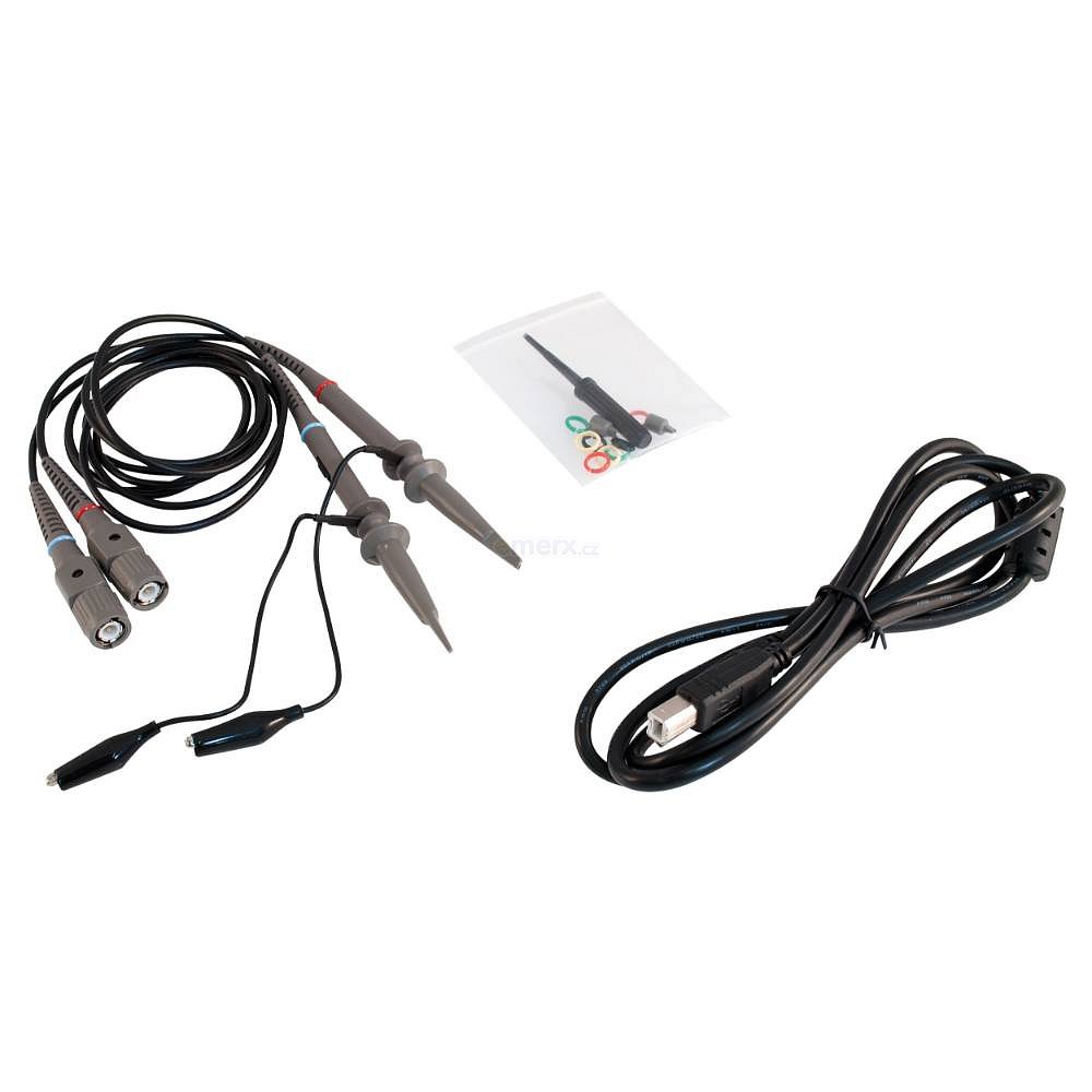 Dvoukanálový stolní osciloskopPřepínání rozsahu sond 1X, 10X, 100X, 1000X Komunikace s PC pomocí USB, podporuje USB flash disky POZOR lze měřit pouze napětí galvanicky oddělené od napájecího napětí osciloskopu!