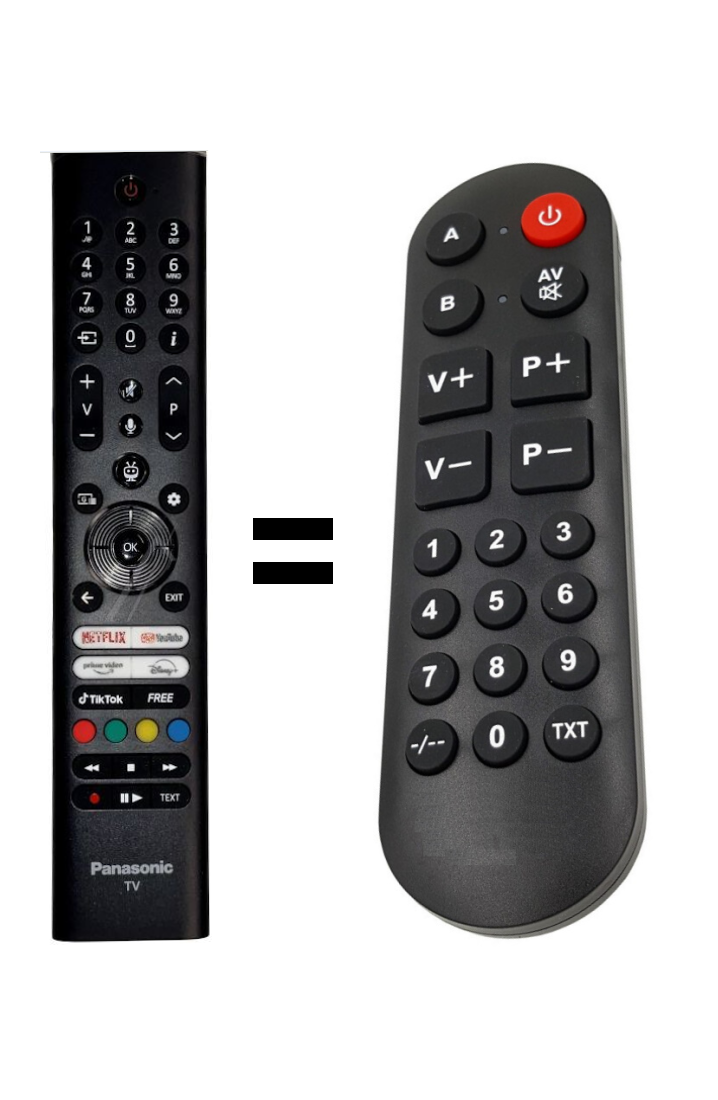 TESTOVÁNO POUZE ZÁKLADNÍ FUNKCE. Náhradní dálkový ovladač pro televizory Panasonic. BEZ HLASOVÉHO OVLÁDÁNÍ. Nepotřebuje párování. R/C45194T. TikTok. 30115816 Například pro modely: TB-43W60AEZ TB-50W60AEZ TB-55W60AEZ TB-65W60AEZ TB-40S45AEZ
