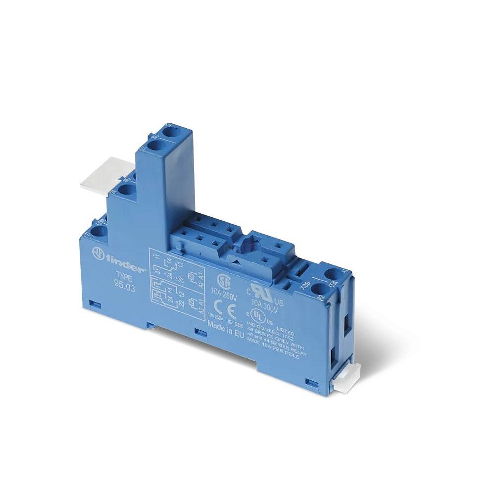 Patice se šroubovými svorkami pro relé FINDER řady 40.31 k upevnění na DIN-lištu.Zatížení vývodů: 10A - 250 VIzolační pevnost: 6 kV (1,2/50 µs) mezi cívkou a kontaktními sadamiKrytí: IP 20Provozní teplota: –40…+70 °C Utahovací moment: 0,5NmDélka odizolování: 7mmMax.průřez vodičů:Drát:mm2 1x6 / 2x2,5 AWG 1x10 / 2x14 Lanko:mm2 1x4 / 2x2,5 AWG 1x12 / 2x14