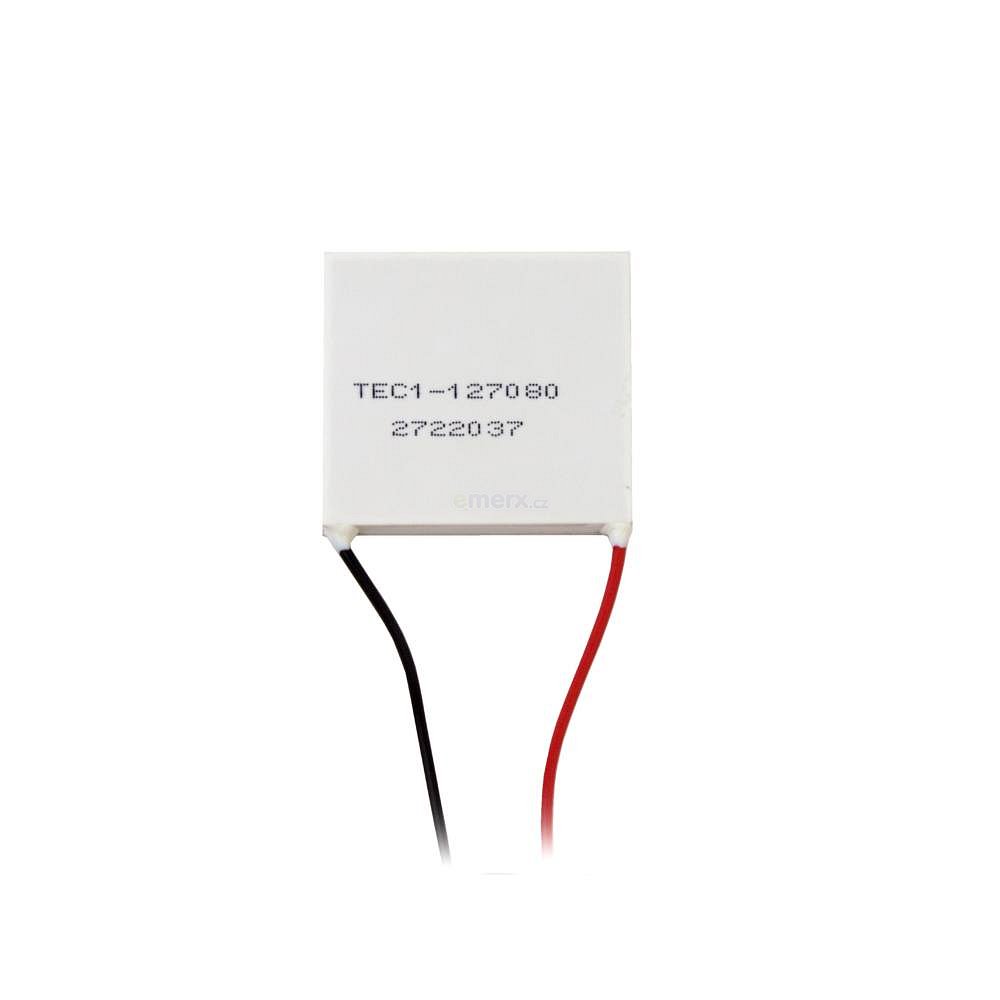 Související produkty jako jsou například teplovodivé pasty, chladiče a ventilátory naleznete v záložce příslušenství pod obrázkem produktu.Aby nedošlo k poškození peltierova článku, důrazně upozorňujeme na nutnost použití chladiče.V opačném případě dojde k nevratnému poškození peltierova článku již po několika sekundách používání bez chladiče!Hlavní výhodyTichý provozVelmi malé rozměrySnadná regulace výkonuOkamžitý efekt chlazení/topeníDosažení nízkých teplot až -20 °CMožnost usměrnit chlazení na velmi malou plochu Snadná změna směru toku - pouze změnou směru elektrického prouduNevýhodyVelká spotřeba prouduNízká účinnost v porovnání s kompresorovým chlazenímPoužitíChladící boxy do autaTeplotní stabilizátoryPrecizní řízení teplotyLékařské zařízeníPo přivedení napětí (+) na červený a (-) na černý vodič, se ohřívá strana s potiskem.
