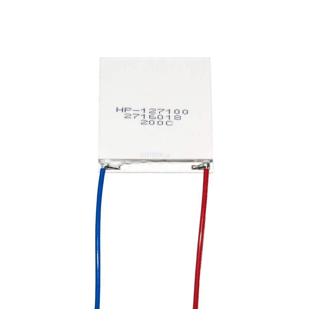 Související produkty jako jsou například teplovodivé pasty, chladiče a ventilátory naleznete v záložce příslušenství pod obrázkem produktu.Aby nedošlo k poškození peltierova článku, důrazně upozorňujeme na nutnost použití chladiče.V opačném případě dojde k nevratnému poškození peltierova článku již po několika sekundách používání bez chladiče!Hlavní výhodyTichý provozVelmi malé rozměrySnadná regulace výkonuOkamžitý efekt chlazení/topeníDosažení nízkých teplot až -20 °CMožnost usměrnit chlazení na velmi malou plochu Snadná změna směru toku - pouze změnou směru elektrického prouduNevýhodyVelká spotřeba prouduNízká účinnost v porovnání s kompresorovým chlazenímPoužitíChladící boxy do autaTeplotní stabilizátoryPrecizní řízení teplotyLékařské zařízeníPo přivedení napětí (+) na červený a (-) na černý vodič, se ohřívá strana s potiskem.