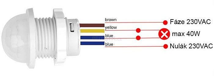 PIR čidlo s pevně nastavenými parametry pro spínání spotřebiče s výkonem max. 40W.