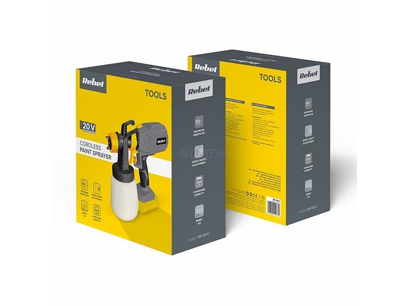 Stříkací pistole Rebel Tools RB-1061.1 je perfektním nástrojem pro ty, kteří si při práci užívají naprosté svobody. Nabíječka a baterie však nejsou součástí sady. Jedná se o univerzální příslušenství, které pasuje na většinu nářadí Rebel Tools. Toto je dobré řešení, pokud je stříkací pistole rozšířením vaší sady elektrického nářadí z této řady, protože zabraňuje zahlcování dílny dalšími nepotřebnými předměty. Pokud však s Rebel Tools teprve začínáte, doplňte sadu baterií RB-2001 a nabíječkou RB-2001-CH.