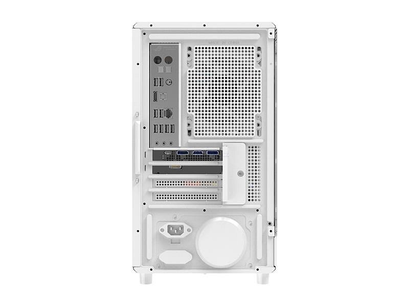 Zadní část skříně je vybavena tvarovaným prostorem a průchozími otvory pro přehledné vedení kabelů. Toto uspořádání usnadňuje instalaci komponent a zlepšuje proudění vzduchu v hlavním prostoru. Na předním panelu se nachází port USB 3.0, 2 porty USB 2.0, jeden port HD Audio a tlačítko napájení. Díky tomu můžete využívat rychlý přístup k základním funkcím, aniž byste museli sahat do zadní části skříně.