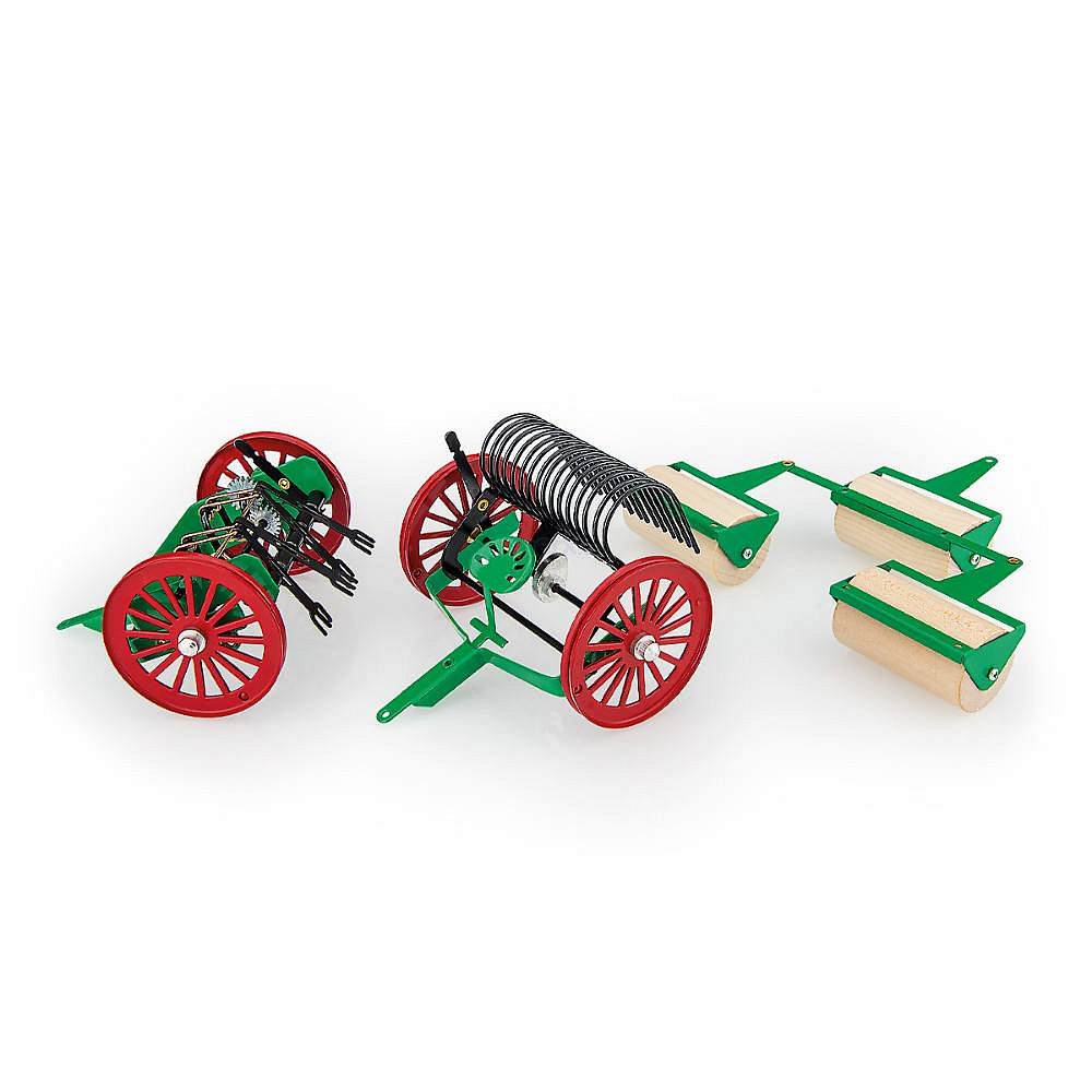 Sada obsahuje přívěsné stroje k traktorům naší výroby - obracečku, pohrabovadlo a dřevěné válce.