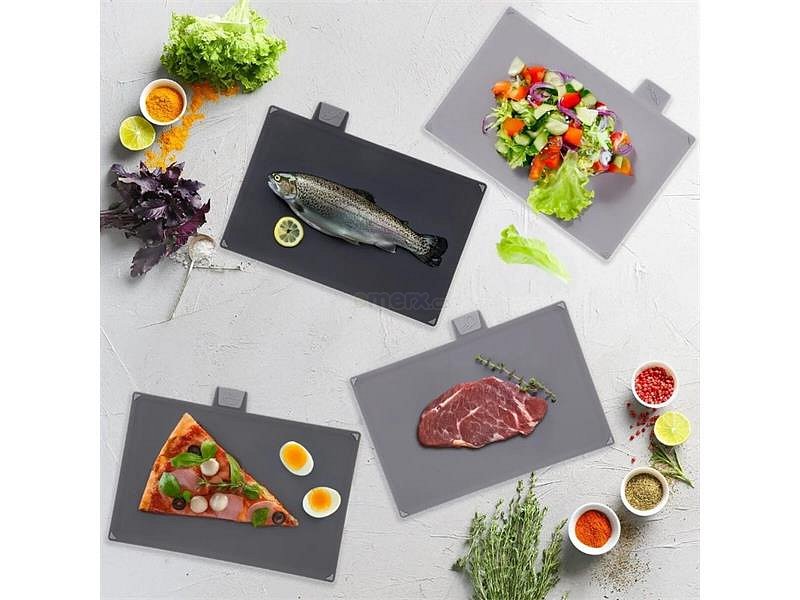Oboustranné krájecí prkénko je tvarované tak, aby z něj šťávy z krájených potravin nestékaly. Protiskluzové podložky ho udrží pevně na místě a prkénko je jimi opatřeno z obou stran. Každé prkénko má štítek s obrázkem, díky němuž můžete rozlišit, na co prkénko používáte – je výhodné mít při vaření prkénka rozdělená na krájení zeleniny, syrového masa, tepelně upravených pokrmů a ryb. Všechna 4 prkénka pohodlně uložíte do stojanu a můžete je mít na kuchyňské lince vždy při ruce. Stojan je opatřen pěnovými podložkami, takže se po podložce nesmeká a nepoškodí ji.
