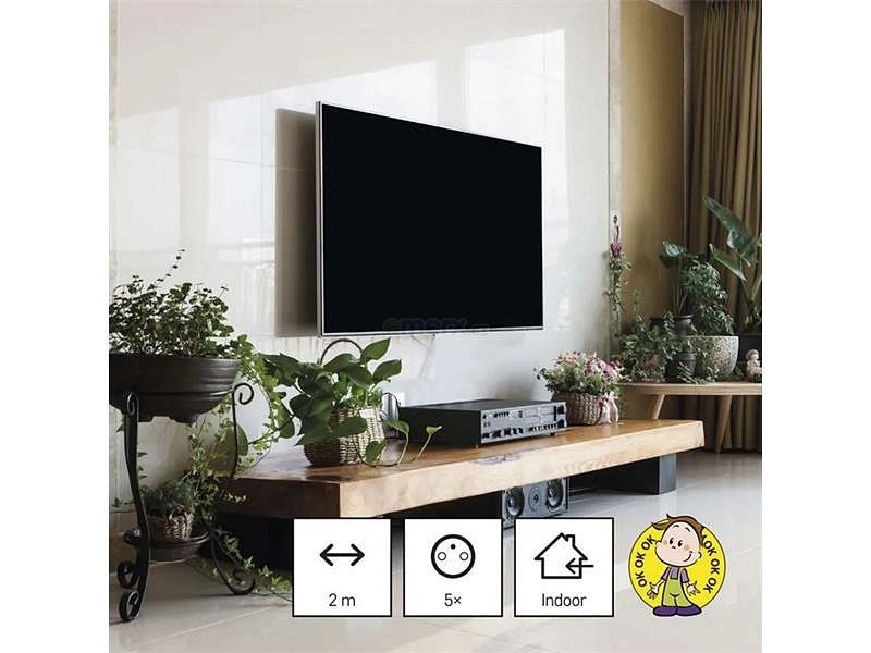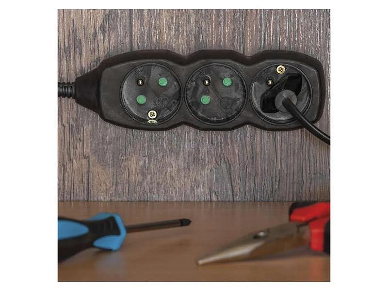 Černý prodlužovací přívod, 5 zásuvek, délkou 2 m a průřezem vodiče 1 mm2. Vhodný pro maximální zátěž 16 A max. Montážní otvory pro přichycení zásuvky na zeď.
