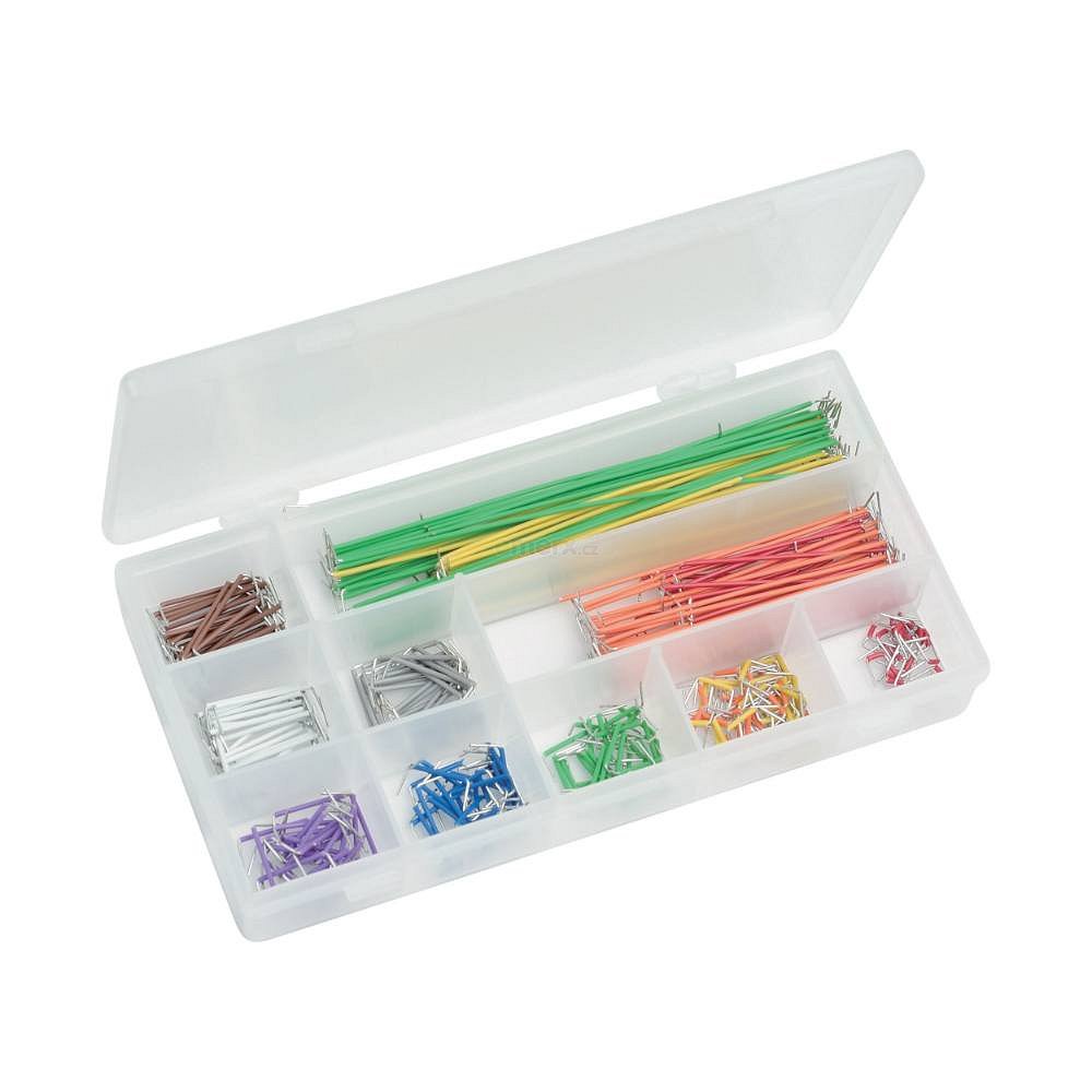 350ks z drátu AWG22 Předstříhané, oholené a ohýbanéRůzné barvy14 různých délek (25ks od každé)Délky: 2, 5, 7, 10, 12, 15, 17, 20, 22, 25, 50, 75, 100 a 125 mmVelikost karabičky: 270 x 130 x 30 mm