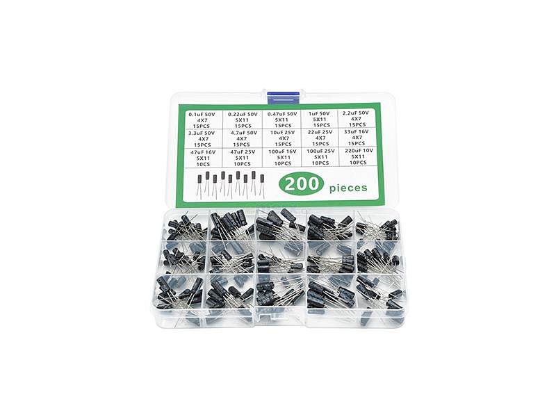 Sada elektrolytických kondenzátorů obsahuje celkem 200 kusů s širokým rozsahem kapacit od 0,1 µF až po 220 µF, což z ní činí ideální doplněk pro různé elektronické projekty. Všechny kondenzátory jsou přehledně uspořádány v praktickém plastovém boxu, který umožňuje snadné skladování a rychlý přístup.