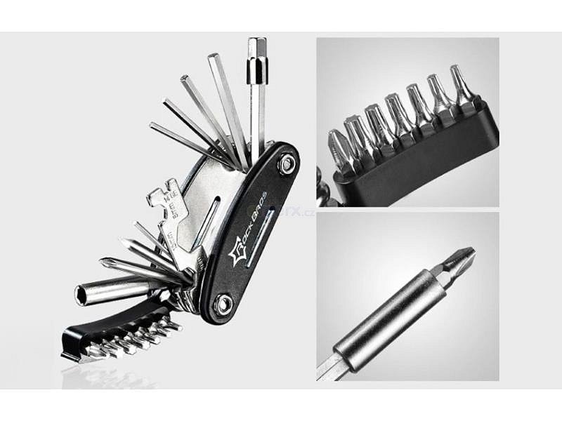 Už se nemusíte bát, že vám nečekaná porucha zkazí výlet na kole a donutí vás jít domů pěšky. Multifunkční kapesní opravářský nástroj Rockbros vám pomůže opravit většinu drobných závad! Tento praktický multitool nabízí až 16 nástrojů v jednom - včetně imbusových klíčů, sady kapesních klíčů, šroubováků a nástrčných hlavic. Navíc je vyrobeno z odolné uhlíkové oceli a má přenosný design.
