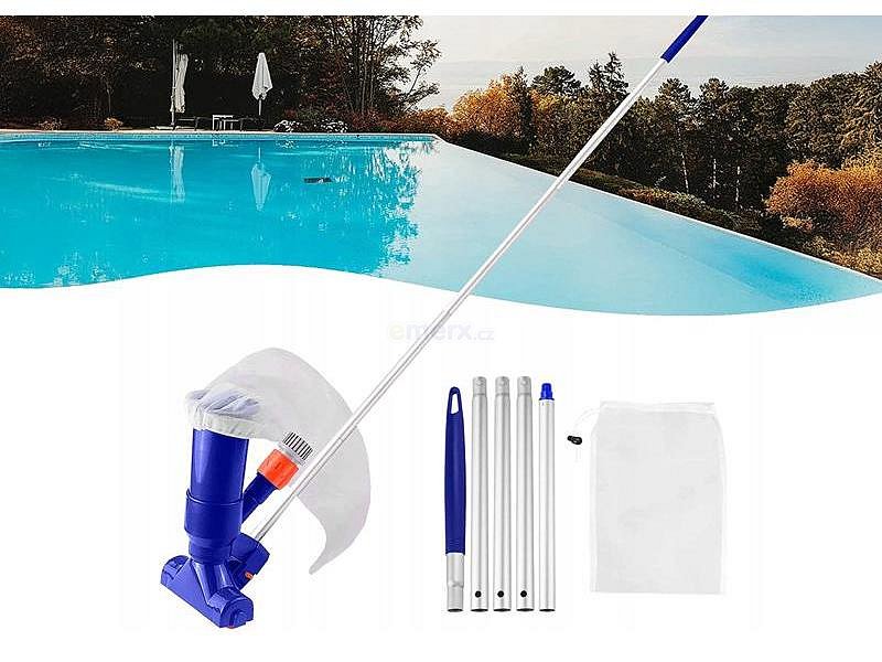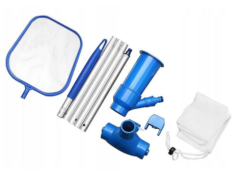 Sada obsahuje bazénový vysavač s filtrem, ideální pro domácí bazény, a univerzální podběrák pro sběr nečistot z vodní hladiny.