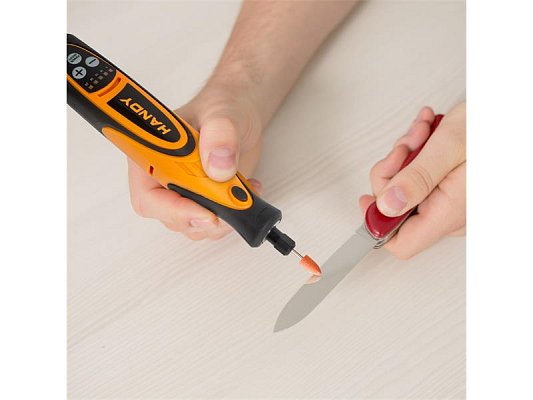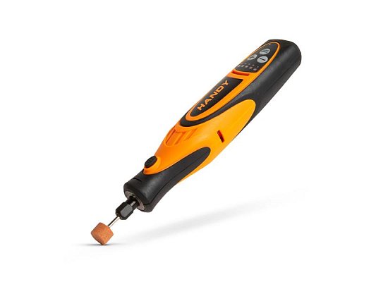 Brusný, gravírovací a vrtací stroj HANDY DRILL byl speciálně vyvinut pro domácí použití, manikúru/pedikúru a domácí kutily. Díky zabudovanému akumulátoru můžete pracovat bez kabelů kdekoli. Umožňuje vám vrtání, leštění, gravírování nebo dokonce vyřezávat menších otvorů. Může to být ideální řešení pro odstranění okrajů otřepů. Maximální kapacita otvoru Ø3,2 mm. Různé doplňky lze snadno a rychle připojit. Díky svým kompaktním rozměrům a hmotnosti je s nářadím snadná manipulace i na obtížně dostupných místech. Může být vhodný také pro přesné obrábění dřeva, kovu a plastů.