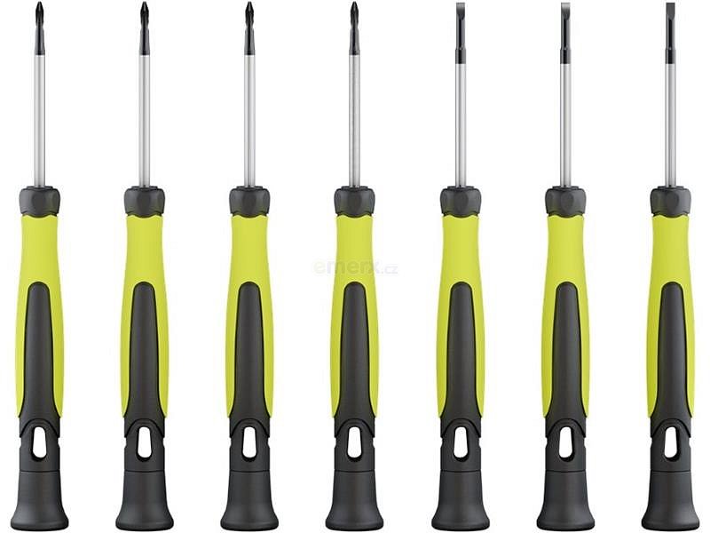 7 šroubováků (2× plochý (2 mm, 3 mm), 3× křížový (PH0, PH1), 3× torx (T6, T8, T10)), úložný box
