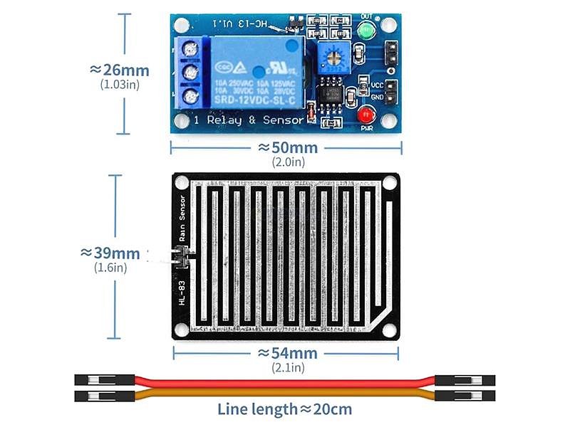 Senzor pro detekci deště s výstupem na kontakty relé. Dvoustavový režim s nastavitelnou citlivostí pro sepnutí.