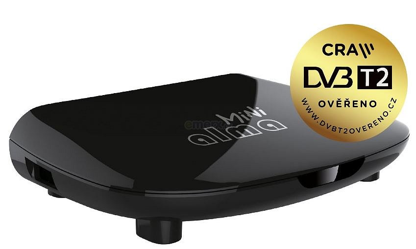 ALMA 2880 Mini, DVB-T2 přijímač, H.265 (HEVC), ověřeno CRA Set-top box ALMA 2880 mini umožňuje přijímat DVB-T/T2 signál, takže si s anténním vysíláním vychutnáte televizní programy ve vysoké kvalitě. Set-top box s funkcionalitou příjmu vysílání DVB T2 vám bude spolehlivě fungovat i po přechodu pozemního vysílání na nový formát. Přijímač prošel odborným testováním Českých Radiokomunikací a získal certifikát DVB T2 ověřeno. Certifikace zaručuje funkčnost přijímače po zahájení řádného DVB-T2 vysílání. Nahrávání a TimeShift: po připojení flashky nebo externího disku do USB můžete nahrávat televizní pořady pro pozdější zhlédnutí. Funkce TimeShift umožní pozastavit si právě vysílané pořady a pustit si je se zpožděním. Multimediální přehrávač: přes záznamové zařízení připojené do USB můžete přehrávat hudbu a videa, nebo prohlížet fotografie. Teletext: zařízení lehce zvládá teletext a teletextové titulky. Malé rozměry: výhodou Set-top boxu Tesla je také jeho malé provedení, které nezabere na televizním stolku téměř žádné místo. Také je možné jej umístit za televizní přijímač. Certifikace: Certifikována českými radiokomunikacemi pro provoz v nové síťi DBV-T2, kódování H.265 (HEVC) Specifikace: Tuner: DVB-T/T2 (HEVC/H.265) Vstupy / výstupy: HDMI, USB, anténní vstup Record Ready: nahrávání a nahrávání s časovým posunem tkzv.Timeshift Podporované multimediální formáty: JPG, MP3, WMA, AVI, MOV, MP4, MPG, MKV, TS, VOB , WMV
